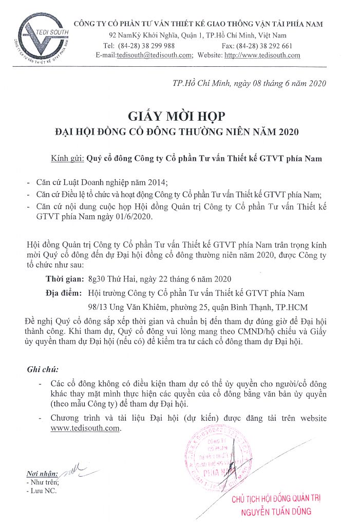 9 Th6 2020 Thông báo mời họp Đại hội đồng Cổ đông thường niên năm 2020 by administrator | posted in: ĐẠI HỘI ĐỒNG CỔ ĐÔNG THƯỜNG NIÊN | 0 Kết quả hoạt động sản xuất kinh doanh năm 2019Tải xuống Kế hoạch phân phối lợi nhuận năm 2019 – 2020Tải xuống Giấy ủy quyền tham dự Đại hội đồng cổ đông năm 2020Tải xuống Kế hoạch sản xuất kinh doanh năm 2020Tải xuống Thông tin cổ đông khác Nghị quyết Đại hội Cổ đông thường niên năm 2025 Thông báo mời họp Đại hội đồng Cổ đông thường niên năm 2025 Nghị quyết Đại hội Cổ đông thường niên năm 2024 Thông báo thay đổi lịch họp Đại hội đồng Cổ đông thường niên năm 2024 Thông báo mời họp Đại hội đồng Cổ đông thường niên năm 2024