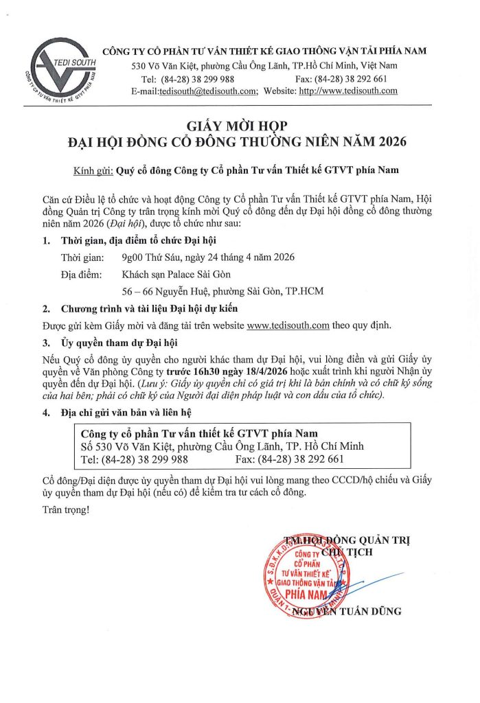 4 Th4 2026 Thông báo mời họp Đại hội đồng Cổ đông thường niên năm 2026 by administrator | posted in: ĐẠI HỘI ĐỒNG CỔ ĐÔNG THƯỜNG NIÊN | 0 Chương trình họp Đại hội đồng cổ đông thường niên năm 2026Tải xuống Kết quả hoạt động sản xuất kinh doanh năm 2025Tải xuống Kế hoạch sản xuất kinh doanh năm 2026Tải xuống Phương án phân phối lợi nhuận năm 2025 và kế hoạch năm 2026Tải xuống Hướng dẫn ứng cử, đề cử thành viên Hội đồng quản trị, Ban kiểm soátTải xuống Giấy ủy quyền tham dự Đại hội đồng cổ đông thường niên năm 2026Tải xuống Thông tin cổ đông khác Thông báo mời họp Đại hội đồng Cổ đông thường niên năm 2026 Nghị quyết Đại hội Cổ đông thường niên năm 2025 Thông báo mời họp Đại hội đồng Cổ đông thường niên năm 2025 Nghị quyết Đại hội Cổ đông thường niên năm 2024 Thông báo thay đổi lịch họp Đại hội đồng Cổ đông thường niên năm 2024